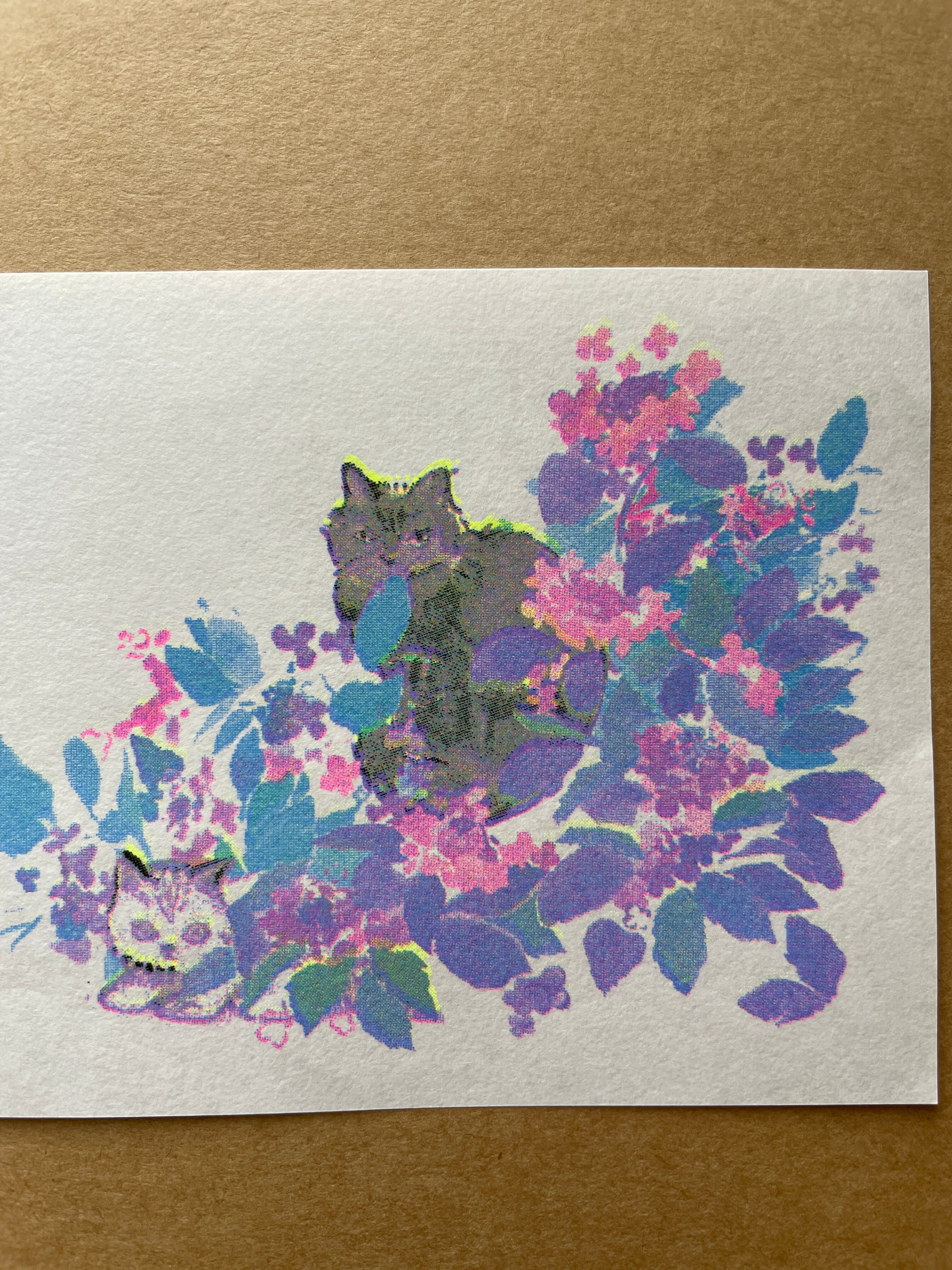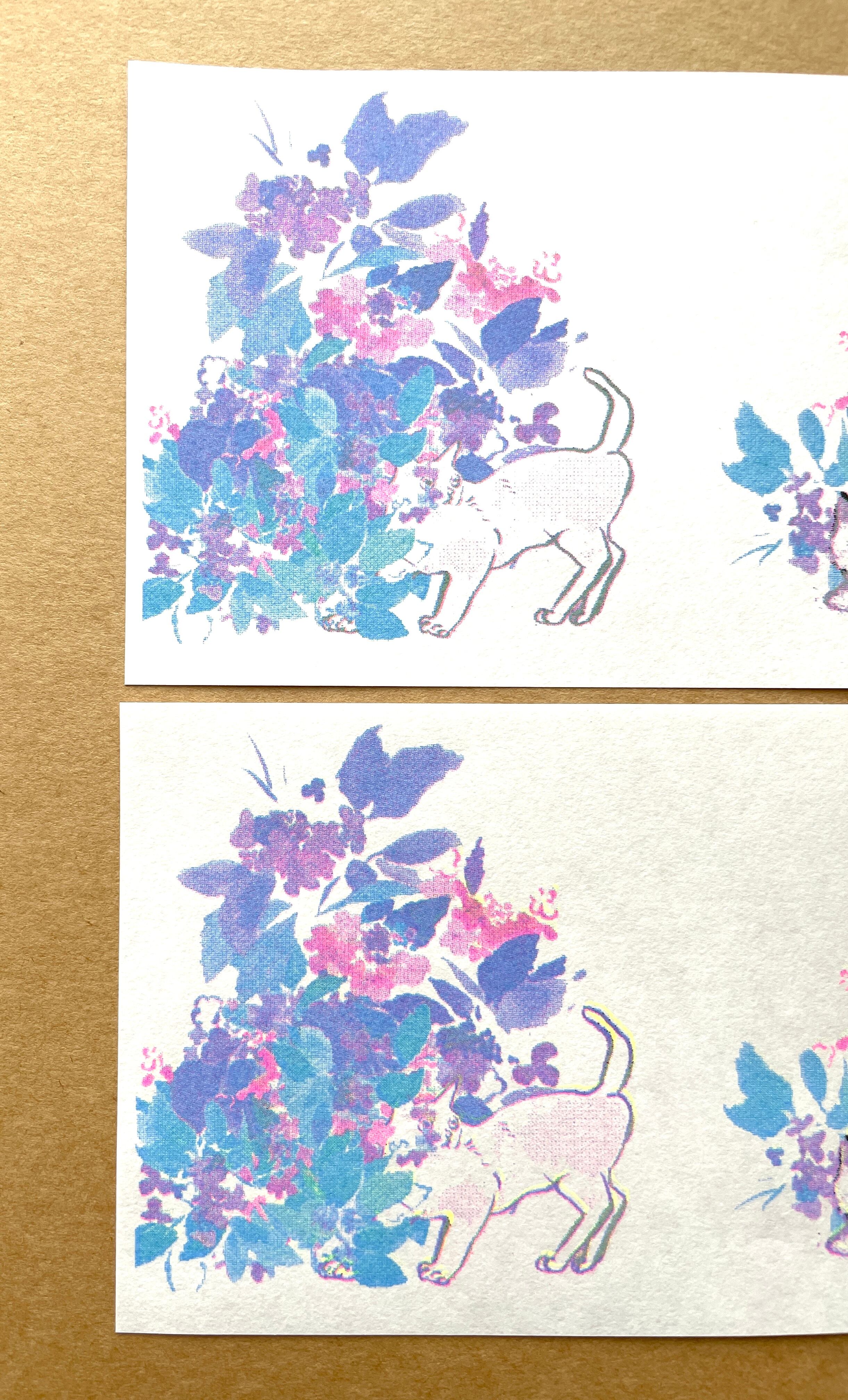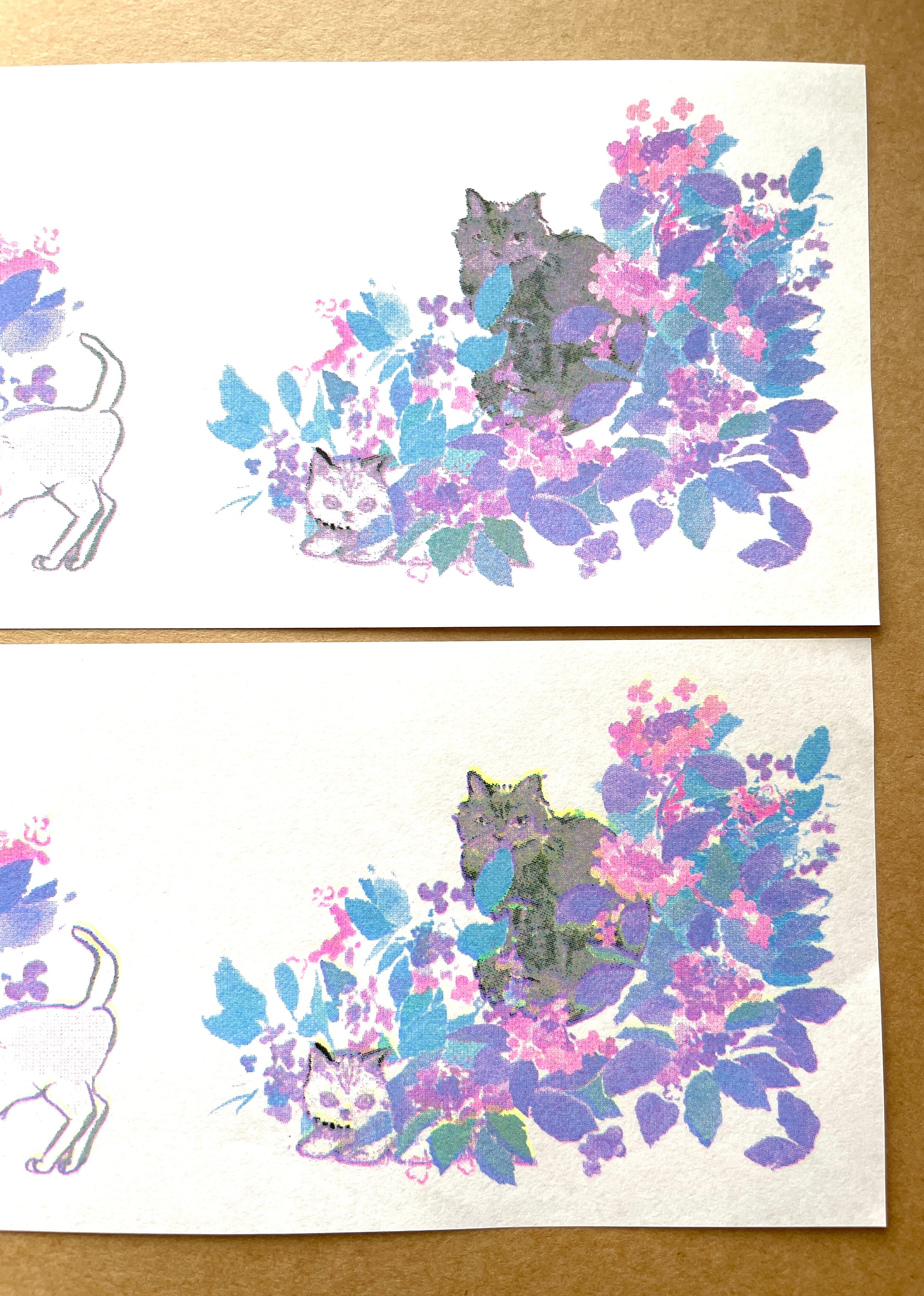 黒、蛍光イエロー、水色、蛍光ピンクの4版それぞれ1色ずつシルクスクリーンのように重ねて仕上げています。印刷はレトロ印刷さん。